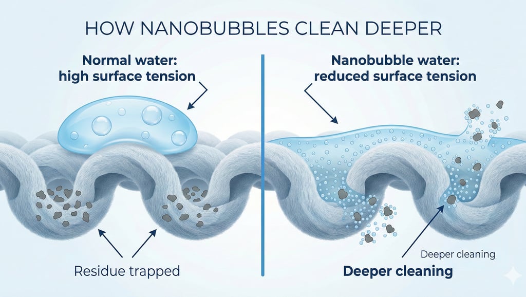 NanoWash uses nanobubbles (also called ultra fine bubbles) to lower water’s surface tension, helping water to penetrate deeper, lift away residues, and leave your clothes naturally fresher.